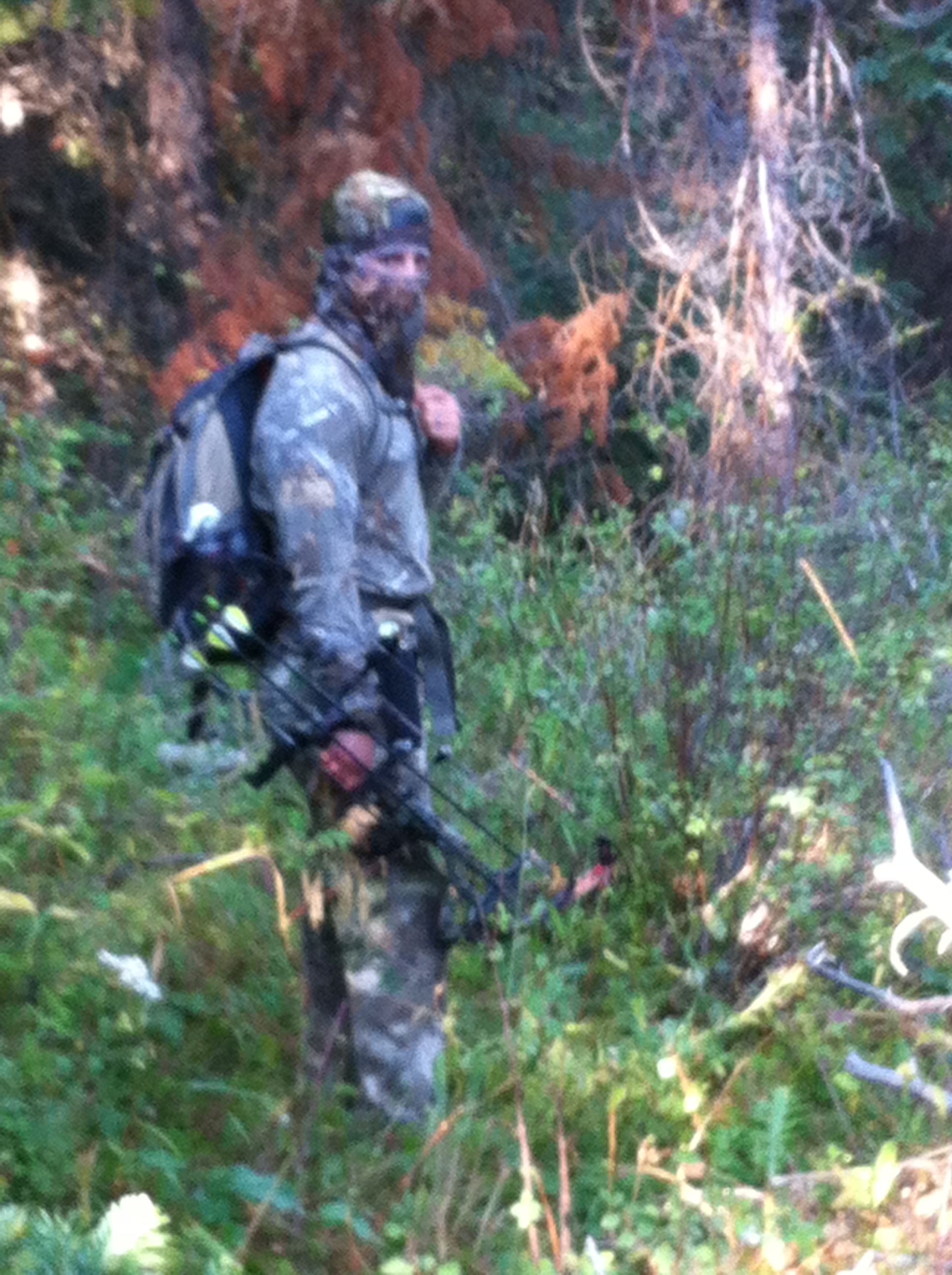 We sit and stare in disbelief as raghorn bull comes up through the underbrush, his young immature horns still covered in reddish velvet. He walks within twenty yards and catches our human scent, stops …sniffs the air then bolts backwards, practically doing a back flip while charging into the deep woods. Our tag is for either a bull or cow elk but the tricky part with hunting bulls is counting horns and brow tines while simultaneously aiming an arrow at the animal chest and praying that your own heart doesn’t explode under the excitement. This is why I just hunt cow elk and leave the bulls for someone else. The raghorn would be illegal to shoot; he’s just a foolish teenager really, with only one thing on his mind.