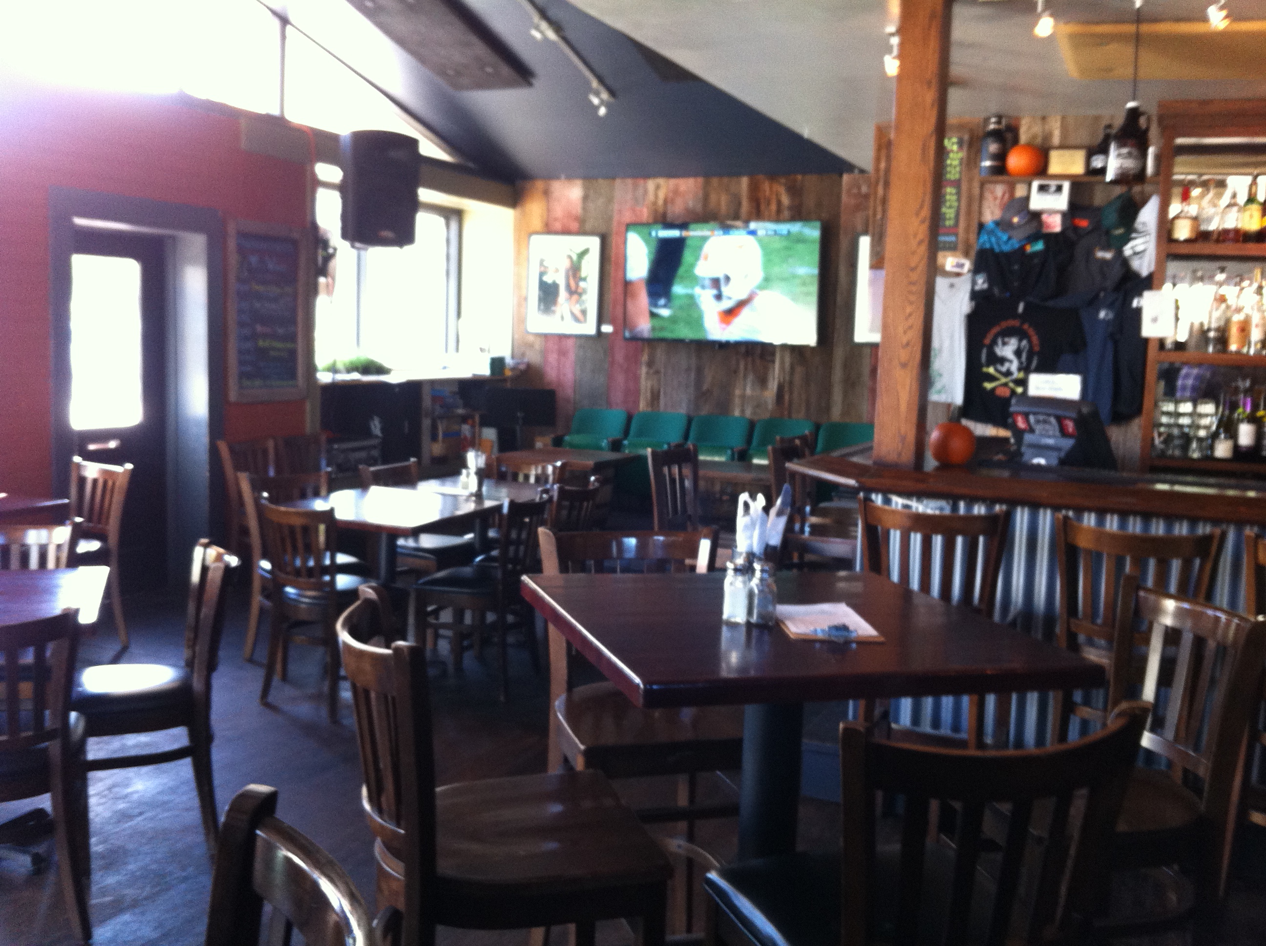 At first I thought we were going into a military recruiting station or maybe a liquor store. The building from the outside has a strong resemblance to a former Post Office. We sit at a high-table against the far wall and take it all in as the waitress brings us four beer tasters to try, which is great that they’re not stingy with their samples. I settle on Avalanche Creek IPA, 6.9% ABV. We order some homemade tortilla chips and salsa both of which are very tasty. It’s relaxed for a late September afternoon; college football is on several overhead TVs, water arrives in what looks like old science experiment bottles from a chemistry class …very cool.