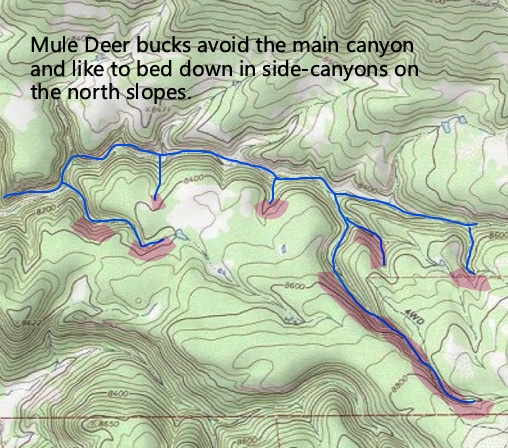 Mule Deer bucks will avoid the main canyon. They head to an offshoot canyon to sleep during daylight hours. Their beds will be on the north slope, where they can look down into the canyon below. This pattern will continue until the weather becomes cold, at which point they will need to switch to the south slopes to warm up.