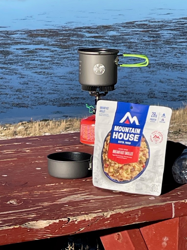 I was expecting to use my Shakespeare rod and reel and cast a Panther Martin lure for trout, but the water around the shore was very weedy, so I passed. Instead, I made breakfast using my Optimus stove with MSR fuel tank. This is a wonderful backpacking stove, and in minutes, I was enjoying a delicious meal of eggs, bacon, and potatoes in the freeze-dried Mountain House meal packet before starting for home.